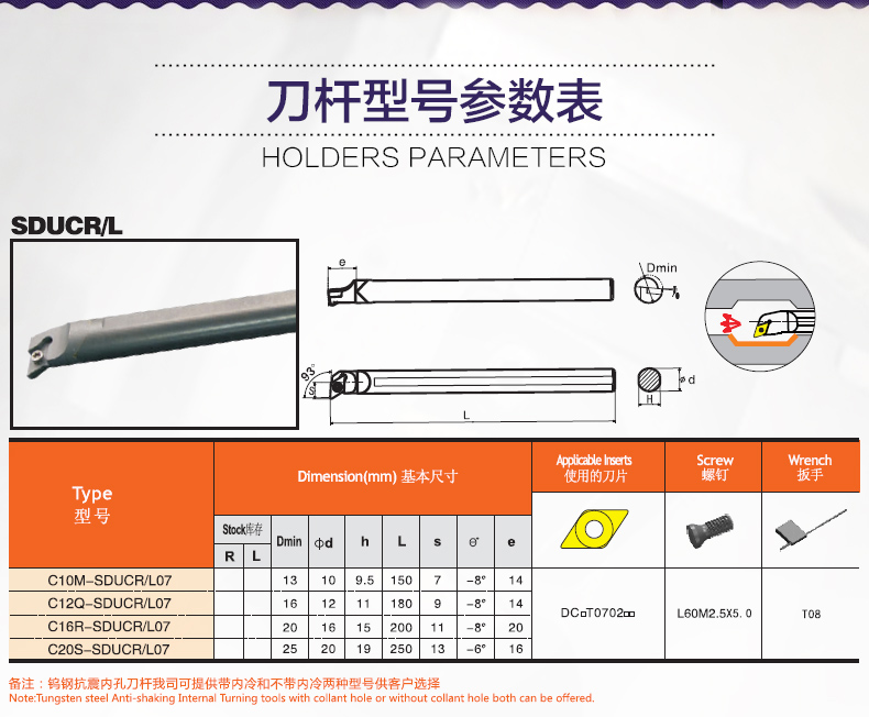 Tungsten Carbide Shock Resistant Bore Turning Tools C10M/C12Q/C16R/C20S-SDUCR07/SDUCL07